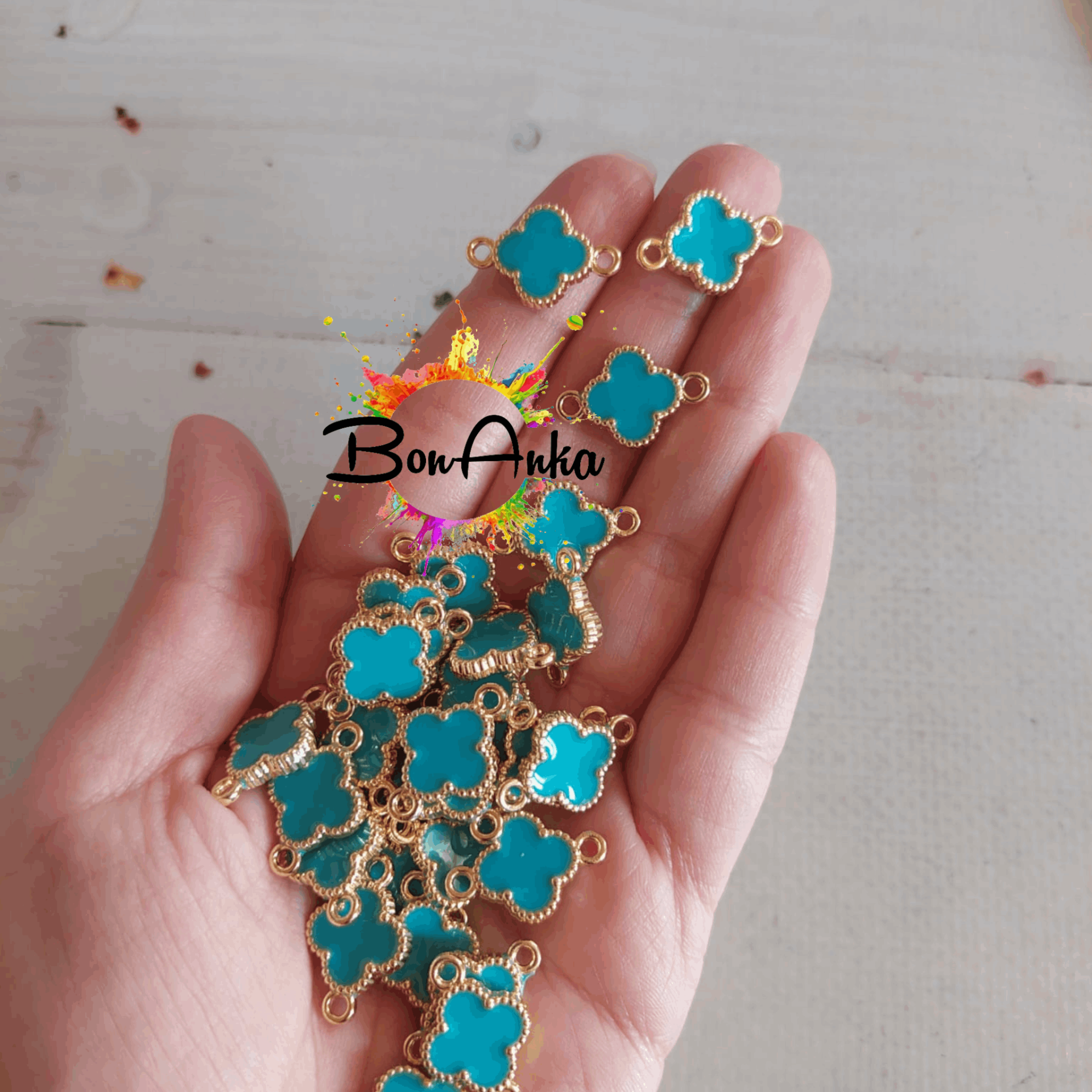Takı tasarımlarınıza zarif ve modern bir dokunuş katmak için ideal olan 1,3 cm Çift Kulplu Çift Yönlü Turkuaz Yonca Ara Aparat, kolye, bileklik ve küpe yapımında sıklıkla tercih edilen kaliteli bir takı malzemesidir. 1,3 cm Çift Kulplu Çift Yönlü Turkuaz Yonca Ara Aparat; dayanıklı yapısı ile uzun süre kullanım sunan bu takı ara aparatı, hem amatör hem de profesyonel takı tasarımcıları için uygundur.