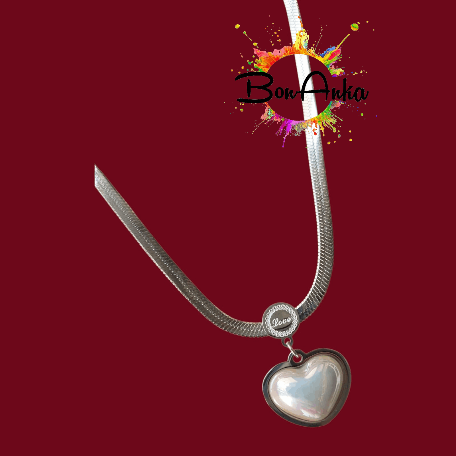 Gümüş Renk Sedef Kalpli Love Yazılı İtalyan Yassı Zincir Çelik Kolye