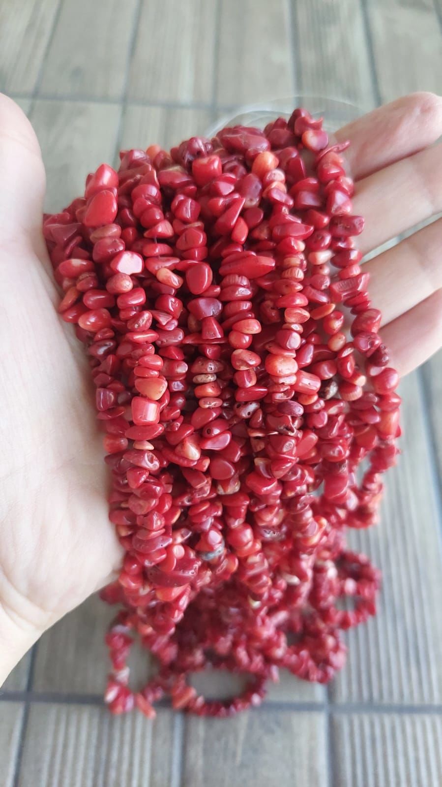 Kırmızı mercan kırık doğal taş dizimiz yaklaşık 80 cm uzunluğundadır.